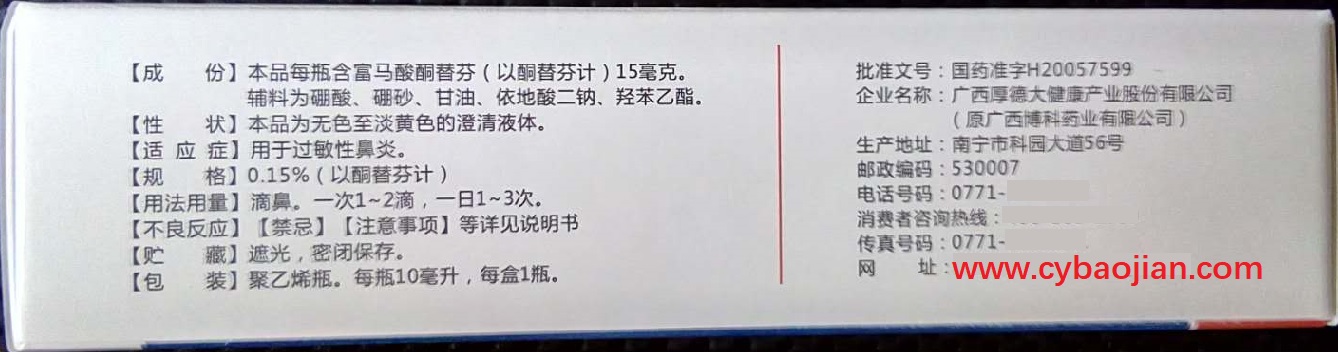 English: Boke Ketotifen fumarate ingredients: each bottle contains 15 mg ketotifen fumarate. The excipients are boric acid, borax, glycerin, disodium edetate and ethyl hydroxybenzoate; properties: This product is colorless to yellowish clear liquid; indications: for allergic rhinitis;Tel: 13077751355 (Wechat same)/Distribution: Guinan Pharmacy, Gonghe Road 9, Nanning, Guangxi/Contact: Miss Chen